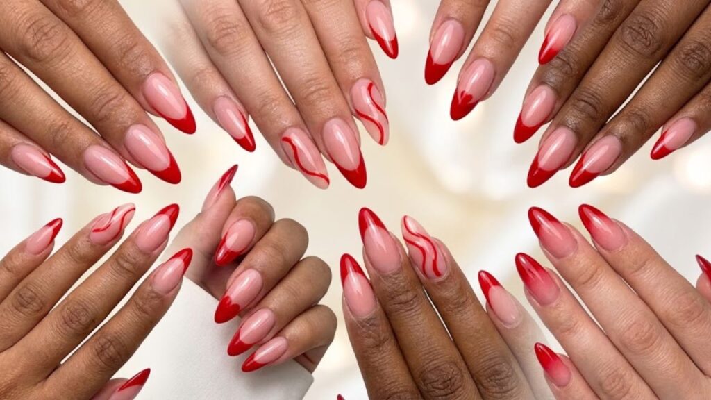 For a softer, more refined style, choose an oval nail shape paired with a thin, delicate red tip.