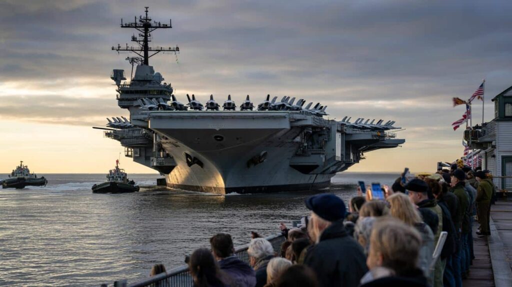 From the shore, the Truman’s return feels like a victory lap. The ship hums with the familiar ritual: brass band warming up somewhere aft, tugboats nudging the carrier into place, sailors shouting across the water in a mix of orders and inside jokes.