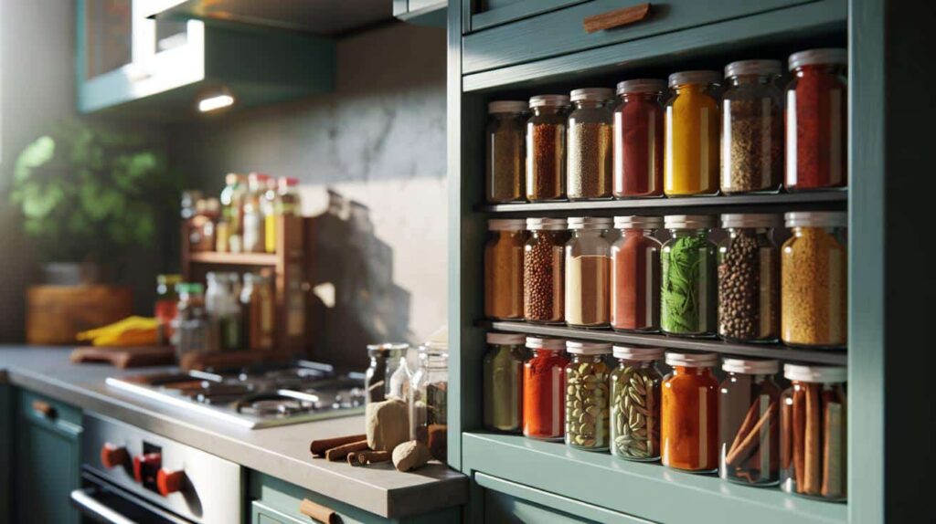 Pour spices into small glass jars with tight-sealing lids, label them clearly, and tuck them into that cabinet. Whole spices stay in one section, ground ones in another. You want to open the door and see a calm, shaded archive of smell, not a colorful battlefield.