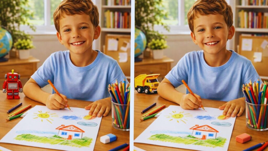 Visual puzzles have a natural way of grabbing your attention. They look easy at first glance but they actually make your brain work harder than you might expect. This spot the difference puzzle featuring a boy drawing is a perfect example of that kind of challenge. You see two images that look nearly identical & you have just 7 seconds to find three small differences hidden in the scene. It sounds simple enough until you actually start the timer. Most people miss at least one detail when they try it for the first time. That is precisely what makes this challenge so fun and difficult to ignore.